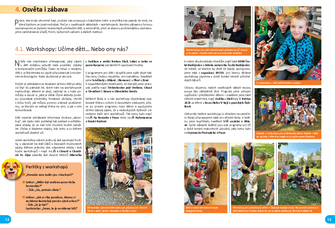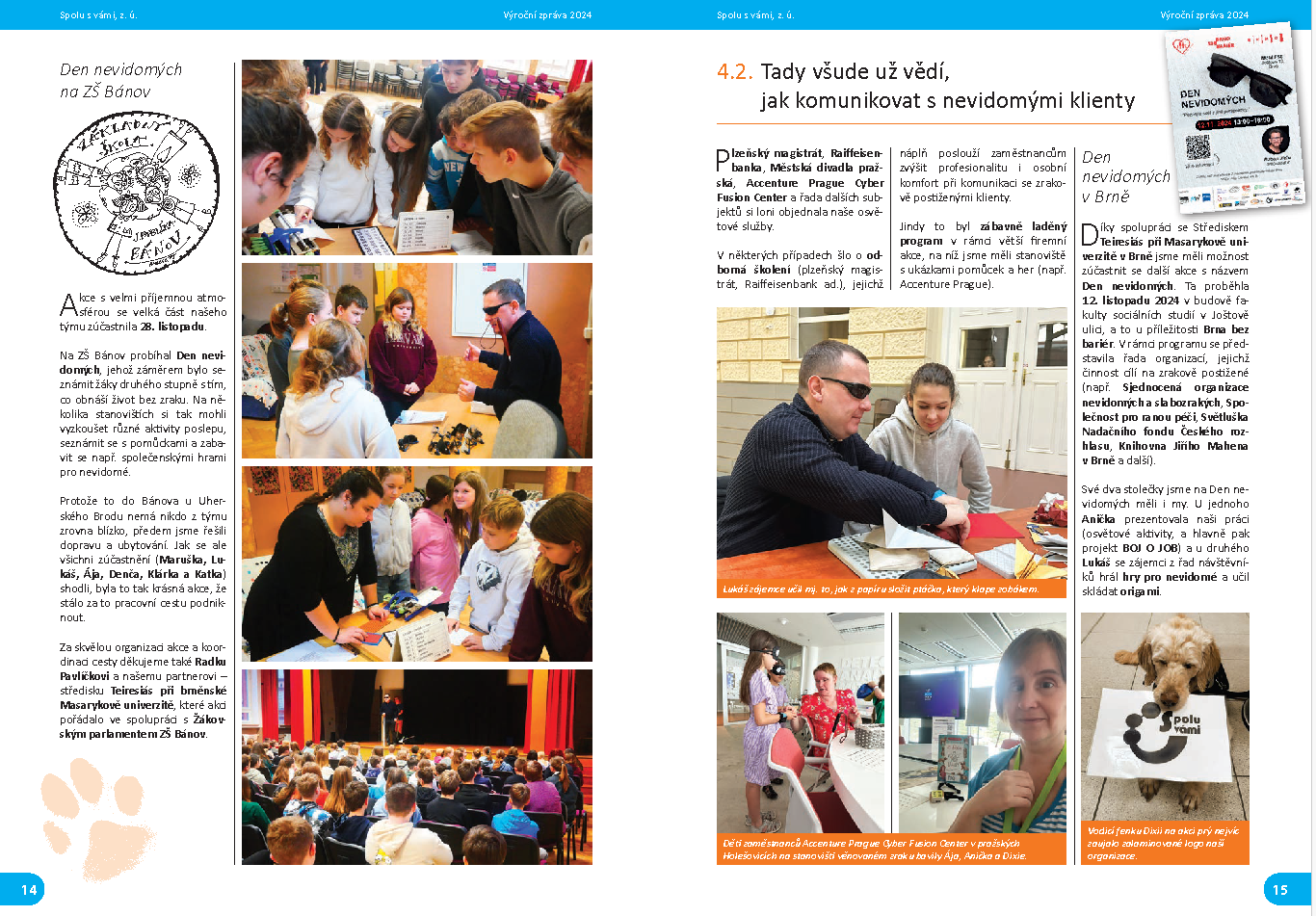 Na dalších stránkách se můžete dočíst nejen o tom, do jakých akcí jsme se loni zapojili (např. Dny nevidomých v Brně nebo v Bánově a další krásné akce), ale také o tom, jak probíhaly workshopy pro děti či návštěvy seniorů.